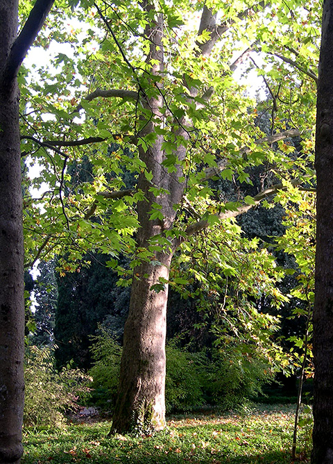 V platanovém háji Nikitské botanické zahrady se nachází jeden exemplář. východní platan s listy liquidambar (Platanus orientalis Liquidambarifolia).